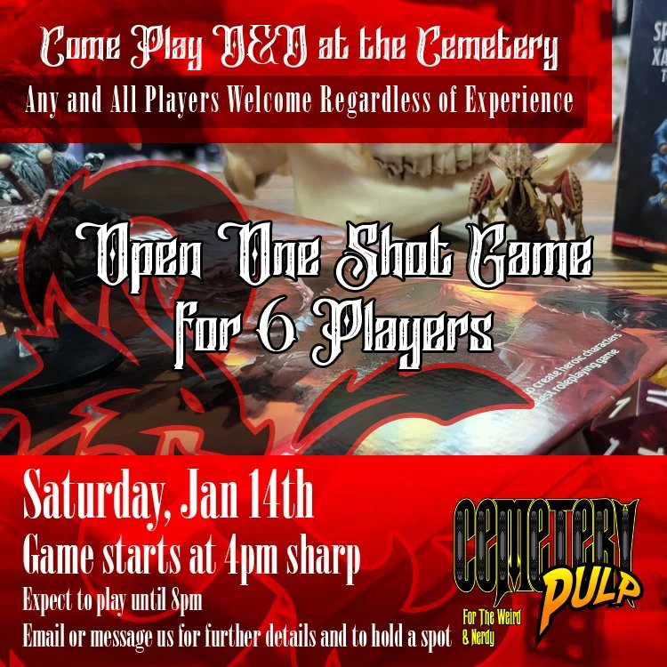 We are going to be holding a D&D One Shot Night for 5th Level Characters. Any players are welcome regardless of experience. If you are brand new to the game and unsure how to play or get a character started, message us and we can have you come down prior to the event and help you out. We will also have pre-generated characters to choose from if you don’t want to make your own. Feel free to sign up with the link below or by messaging us. This event is free, but please only sign up if you can make it so we have a full table.