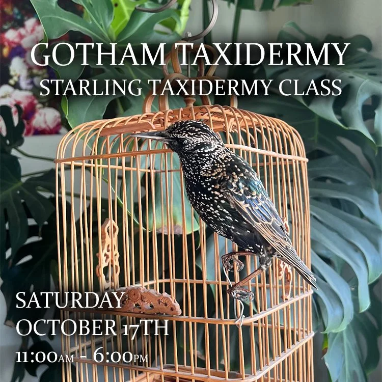 Saturday’s Class will be Starling Taxidermy. In this class, we will learn about the fascinating anatomy of birds and traditional bird taxidermy. This class is designed for beginners with an interest in bird taxidermy. No matter the experience level, all are welcome!